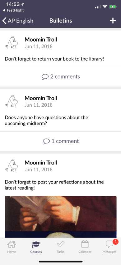 To add a bulletin, the teacher can select the "+" button in the top right corner of the app.