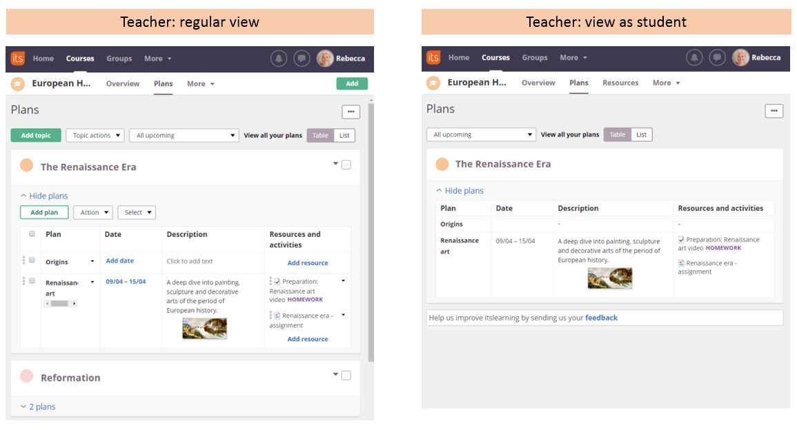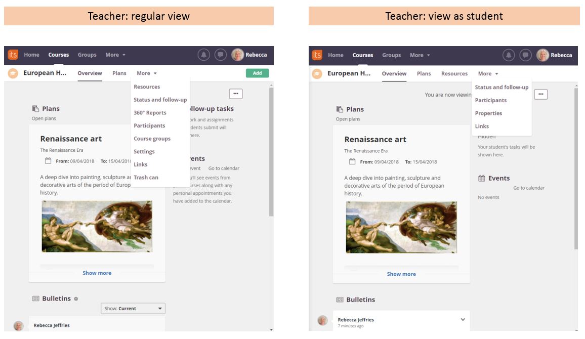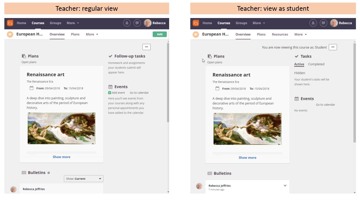 after the back to school update this autumn the student view and the teacher view are so alike that there should be no need for the old teacher-student-guest switch. Please have a look at the attached example from the course overview page. Teachers have post and edit rights that students don't have. Students have a Task menu and teachers a Follow-up tasks menu. The rest of the two views are alike.