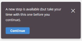 Because the pop up text appears on every information page it causes students to find themselves in an infinite race to study the next step before they study the current step. Especially because the button indicates you need to click there to move along to the suggested next page.