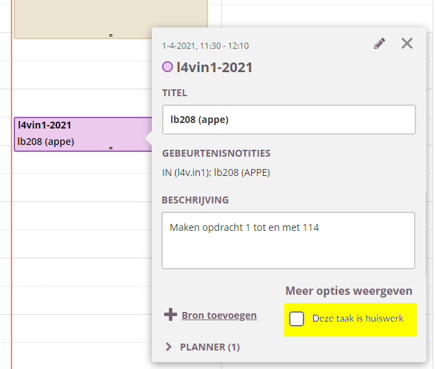 Homework for students is often just a text as "Making 1-13, reading page 1 and 2" In the current situation as a techer I have to make a Task en give this task a deadline en option Homework. Then it is visable for the student in the list of tasks and homework. 9 mouse-clicks nessesary. A lot of work for a simple sentence of homework. Can you make it possible in de Calender Event an option (checkbox) for homework (like in task) Whene this option is active the comtent of the discription wil appear in de homework overview/tasklist