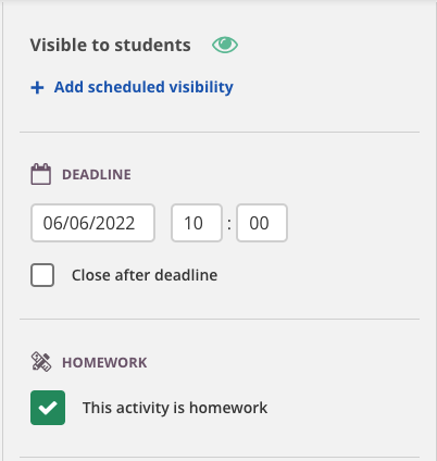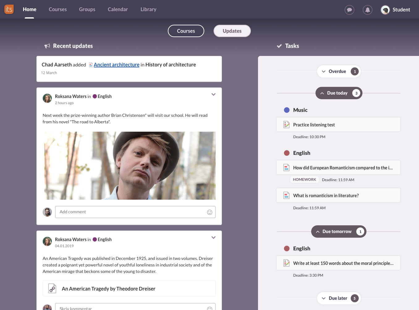 If teachers are adding dates to their assignments and tests (as well as other activities), they will show in students task list. On their homepage (updates) students will see their tasks for all courses and if they go to their courses, they will see the task list for that specific course. In addition, tasks with a deadline will appear in the calendar. As you can see from the attached file, teachers can also mark an activity as homework. Then this information will also show in task list and in the calendar.