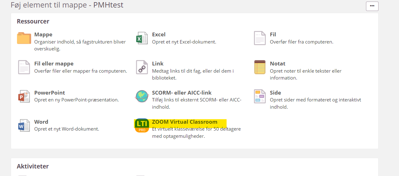 Når man vil anvende Teams, kan man i dag indsætte møder via editoren. Vi kunne ønske os at der også var den mulighed at indsætte et møde som vi kender fra f.eks. ZOOM via ressourcer (se billede)