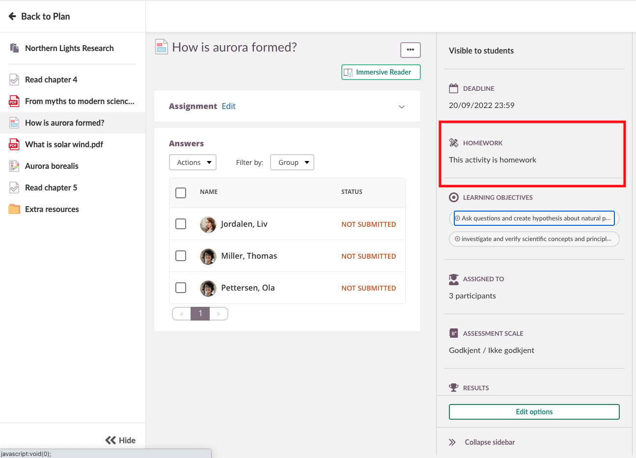 Hi, thanks for your idea. Not sure if you are using old or new planner? In new planner you will not see if a task is homework, when just opening the plan to see plan details. The reason for not showing the information here, is that we have chosen to display information related to students' progress. We want it to be easy for teachers to see how many students that have submitted a task. When opening the task within the plan context, teachers can however see if the task is assigned as homework or not.