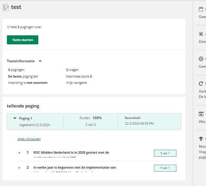 When you configure a Test, and you have configured the Test with multiple attempts, and you have completed the first attempt. Then you will immediately receive a green button for the next attempt.