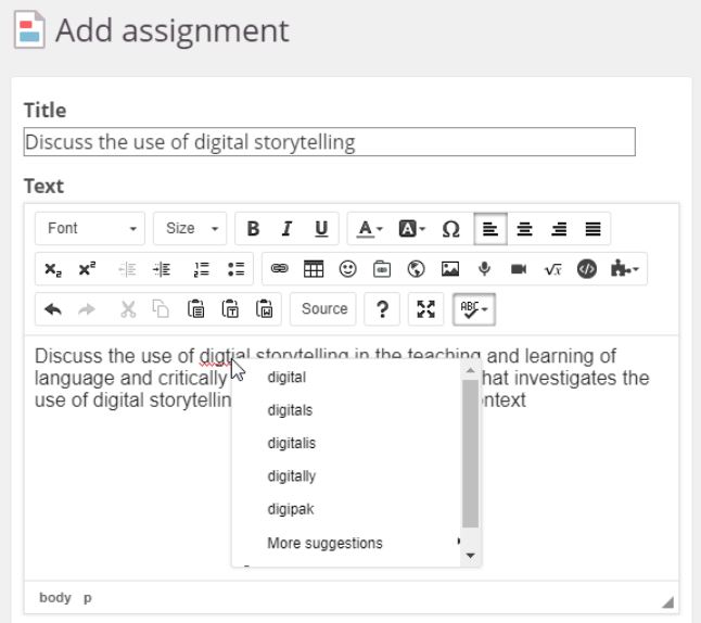 Most operation systems and web browser has a built in spell checker. You can see this when e.g. writing a new bulletin post (if it’s not turned off on your computer). However, we cannot use a spell checking in a good way in the rich text editor partly because the plug-ins demands the right click functionality that the spell checkers also use...There are however browsers/operation systems (Chrome on iOS I think) that mange to apply their spell checker in the rich text editor, but this is not a part of itslearning as such.
